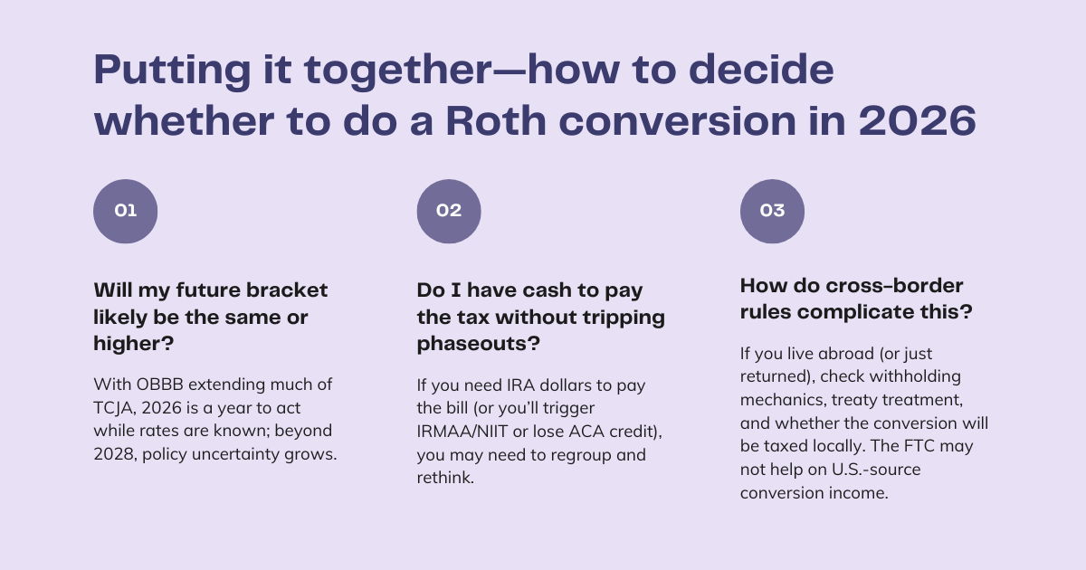 Zooming out, with recent changes keeping many TCJA-era brackets in place (for now), 2026 can be a smart year to “fill your bracket” while rates are known. If your life has cross-border layers, this decision sits alongside visa timing, state domicile, and treaty rules, which is why we frame it through a cross-border lens.