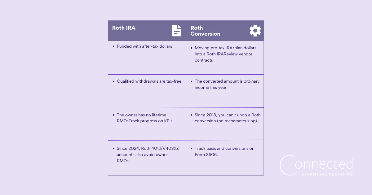 If you’re evaluating a conversion, remember that moving pre-tax dollars to Roth creates ordinary income this year, and you’ll track the taxable vs. nontaxable portion on IRS Form 8606.